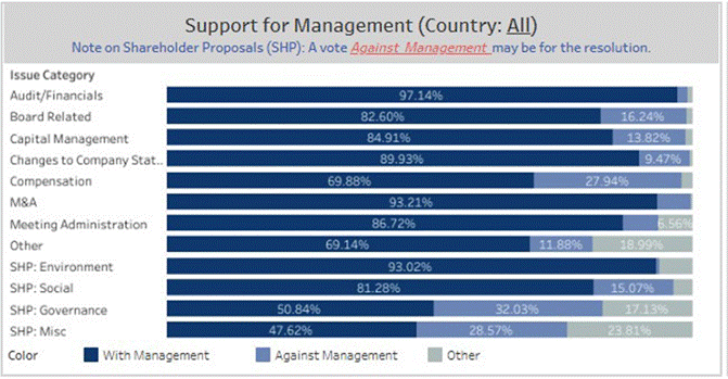 During fiscal year 2023-24, staff cast votes at 12,584 companies worldwide, an all-time fiscal year high for the SBA, voting on ballot items including director elections, audit firm ratification, executive compensation plans, mergers & acquisitions, and a variety of other management and shareowner proposals. These votes involved 114,660 distinct voting items—voting 82.3% “For’’ and 15.6% “Against”, with the remaining 2.1% involving abstentions. Of all votes cast, 15.4 percent were “Against” the management-recommended-vote. SBA proxy voting was conducted across 67 countries, with the top five countries comprised of the United States (2,747 votes), China (2,387), India (1,424), Japan (1,306), and South Korea (609). The SBA actively engages portfolio companies throughout the year, addressing corporate governance concerns and seeking opportunities to improve alignment with the interests of our beneficiaries. Highlights from the 2024 U.S. proxy season included high settlement rates among contested board elections since the introduction of the universal proxy card (UPC), continued investor opposition to “over-boarded” directors, the emergence of artificial intelligence (AI) governance, and further year-over-year declines in shareowner support for some types of environmental and social topic proposals.